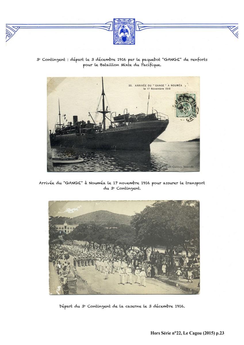 De 1915 à 1917, quatre contingents de mobilisés et volontaires calédoniens mais aussi tahitiens et hébridais partirent vers le front d’Europe ou d’Orient.